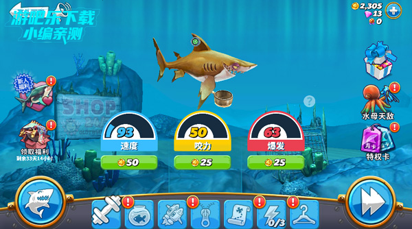 在游戏中玩家可以使用金币对鲨鱼的速度、血量、撕咬的范围进行升级,升级后可以使得鲨鱼的捕杀能力有了很大的提高。玩家在进行游戏的时候能升级就尽量的升级吧。