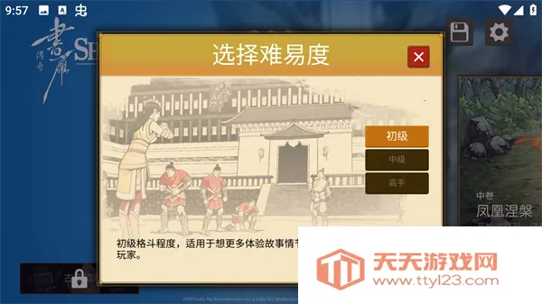 新手进入游戏,章节全解锁,选好难易度后,会有剧情引导,还有多元化选项。战斗初期可无脑攻击,单挑则需合理攻防。游戏难度较简单。