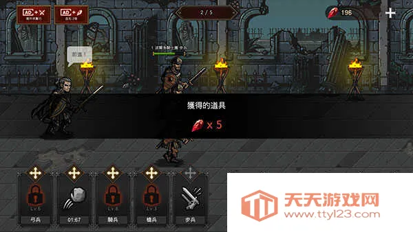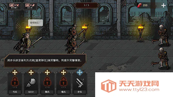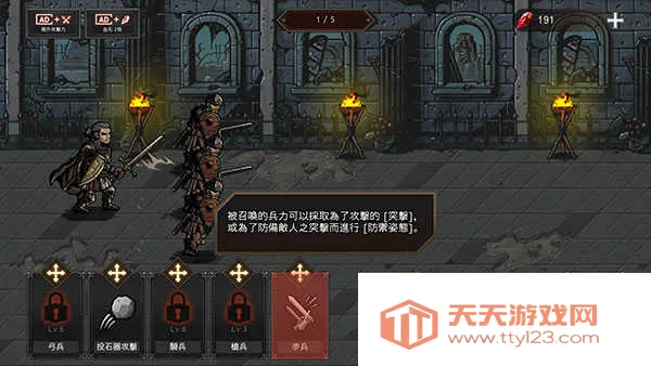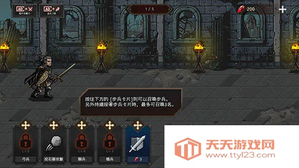 1、打开国王之血防御最新版,首先我们进入教学关,跟着指引一步一步熟悉游戏的玩法,按住下方的步兵卡片可以召唤步兵,持续按着步兵卡片时,最多可召唤3名,