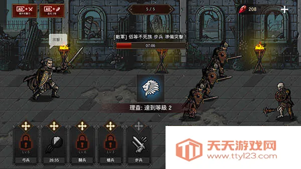 7、发起突击命令时,所有的士兵都会主动对敌人发起进攻。当获取到足够的经验时,英雄和士兵都会获得升级,