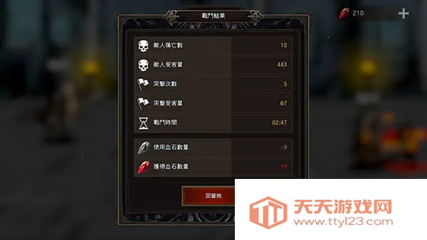 8、消灭完所有敌人或者战斗结束后会进入结算界面,这里会显示战斗的一些总结信息,以上就是国王之血防御最新版的玩法了。