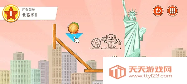 攻略也很简单,进入游戏点击中心播放按钮,右边选模式,左下角可返回主页,选好模式就挑战关卡。点击蓝色玻璃块敲碎让汉堡掉落,滚到猫咪身边它就能吃到。每个关卡难度不同,完成任务拿星星。