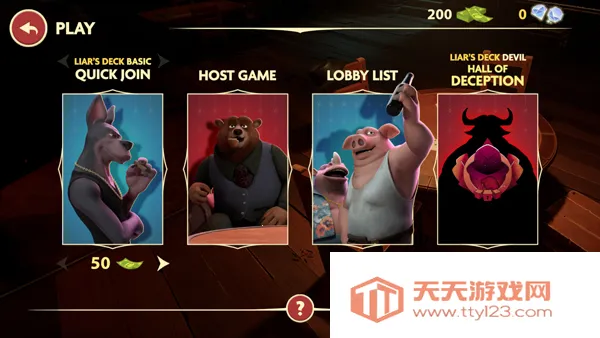 骗酒馆这款多人在线手游超好玩!在3人游戏中,玩法刺激又烧脑。开局点击“enterthebar”,再点“quickjoin”快速加入对局,等系统匹配玩家。进入游戏后,玩家轮流出牌并声明牌面数值,得和桌面要求匹配,比如国王或皇后。出牌时可以撒谎,要是被怀疑撒谎,就会被揭穿,然后进行俄罗斯轮盘,6发子弹中活下来才能继续游戏,失败游戏就结束。牌局重置后继续,直到一方获胜。还有商店能用钻石买新角色,带来多样体验。它有扑克牌和骰子两种玩法,都考验心理素质和运气。玩的时候玩家轮流出牌,能选翻不翻牌,牌不对就自己对自己开枪。每局都要决出胜利者,非常刺激。不管是喜欢心理博弈还是追求刺激体验,骗酒馆3人游戏都能满足你,快来试试吧!