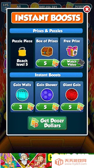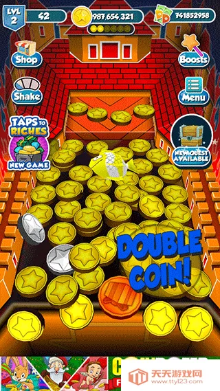 金币推土机最新手机版是一款趣味十足的推金币游戏,采用卡通风格,画面精致。操作简单,新手老手易上手。开始有50枚硬币,通过投掷获更多金币,过程中能得多种道具,如狗、鱼等,还有3D视角、多特色场景,目标是赚更多金币。
