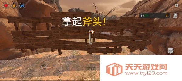 3、进行游戏如图,玩家首先需要拾取挂在木岚上的斧头,然后劈开木栏;
