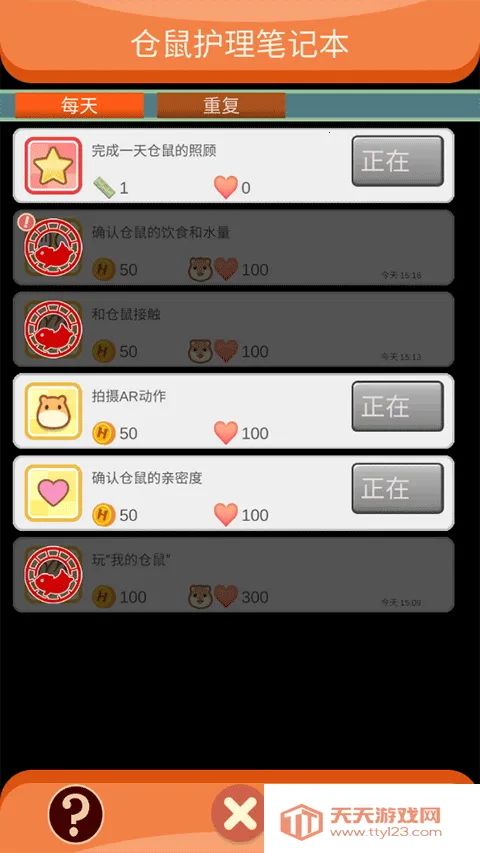 玩法很丰富。开局能选喜欢的仓鼠,自定义性别和名字。每天要检查饲料和饮水槽,及时补给。轻触仓鼠可互动提升亲密度,还能得金币。笼子脏了会影响仓鼠健康,点击就能打扫。完成任务积累仓鼠票,能换限定物品。购置道具能拓展互动方式。