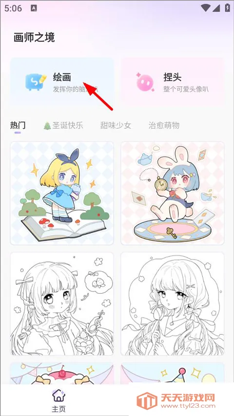 1、用户打开画师之境app,登录进入主页,主页中有各种热门、治愈、甜味素材,用户可选择喜欢的进行涂色,点击左上角绘画;
