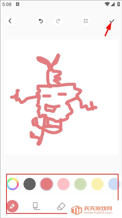 3、打开画板页面,页面下方是工具栏,用户可选择颜色、画笔进行创作,创作完场后点击右上角保存即可;
