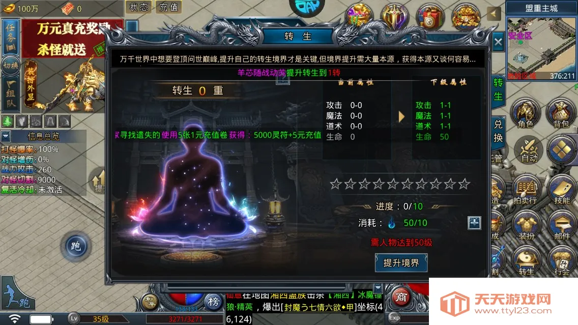 4、到达一定等级后可对游戏角色进行转生,转生可以大幅其实游戏角色的属性上限。