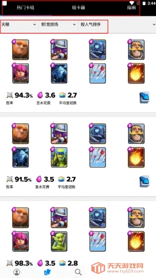卡组主要分为热门卡组、组卡器和指南这三大块,热门卡组从天梯、竞技场等级以及人气这三个元素来筛选;组卡器就是通过你的卡牌来进行收藏;指南就是包含卡组的玩法攻略。