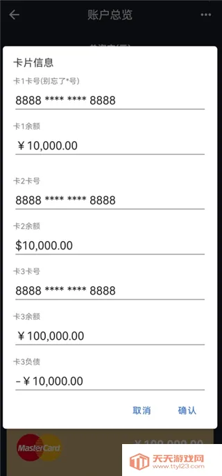 6、银行卡功能可以同时设置三张银行卡的金额,卡号也能设置。