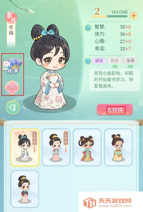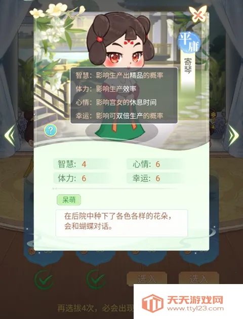 1、完成采女选拔后就会变为宫女,玩家在宫女页面可以查看其信息,还有专属故事以及立绘可以查看。