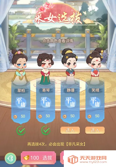 1、玩家点击右下角的选拔即可进行采女的选拔,选择合适的采女加入宫中进行工作。