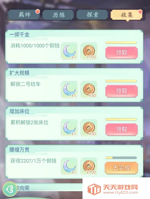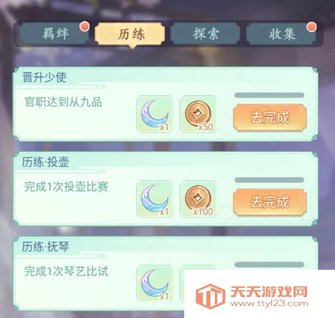 历练成就目前只有官职、投壶、抚琴三个成就任务,完成就可领取成就奖励。