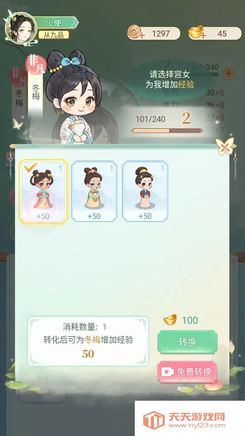 2、宫女还可以进行升级,消耗低级宫女进行转换升级。