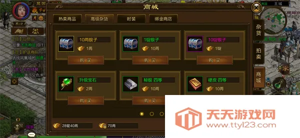 商城有出售升级宝石、硬皮、秘银,只要花费金子就能购买,也可在绑金商店使用绑定金子购买秘银、硬皮。每周商城还会退出限购礼包,可根据自己的策略购买礼包哦!