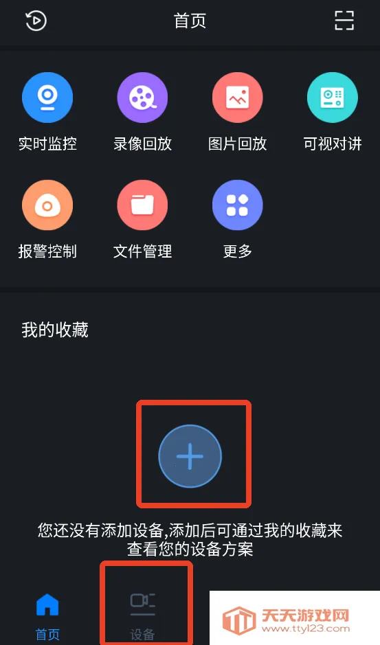 2、来到首页点击下方【+】号添加设备,成功添加后可以在【我的收藏】查看自己的设备方案,或者直接点击下放第二个【设备】也可以。