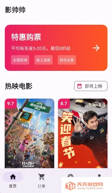影帅帅特价电影票手机版,有大量特惠购票资源。能同步热映电影资讯,附详细介绍,可提前了解待映片,智能推荐附近影院,开放预售,有低价场次,还能查订单、看详情,购票便捷又实惠。