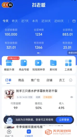 2、软件订单页面可查看当天的数据,有橱窗升佣、商品专题、短视频种草等功能。