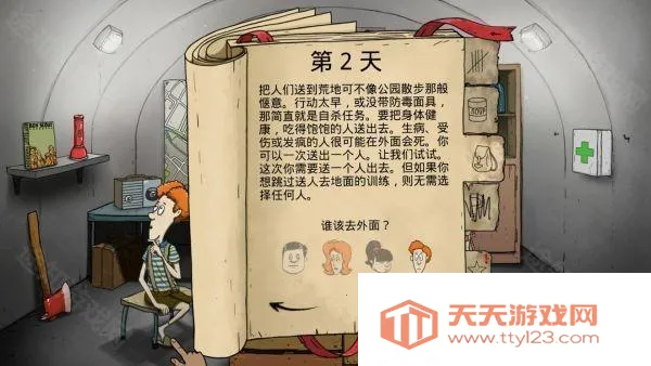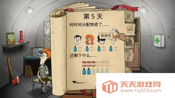 1、物资差不多2水1食物,前期要派(卖)一个人去找物资,注意不要让这个人生病,不然后面会很不好过