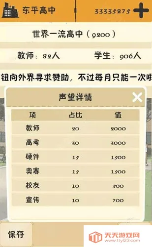 这是一个以不破产的前提下提升声望的游戏,教师声望要特级教师才给,高考就是学生考上顶级会有,(素质与考上国外大学有关,社团全点,感觉社团一点也不影响奥赛,后期点不点都是2个一等奖)。