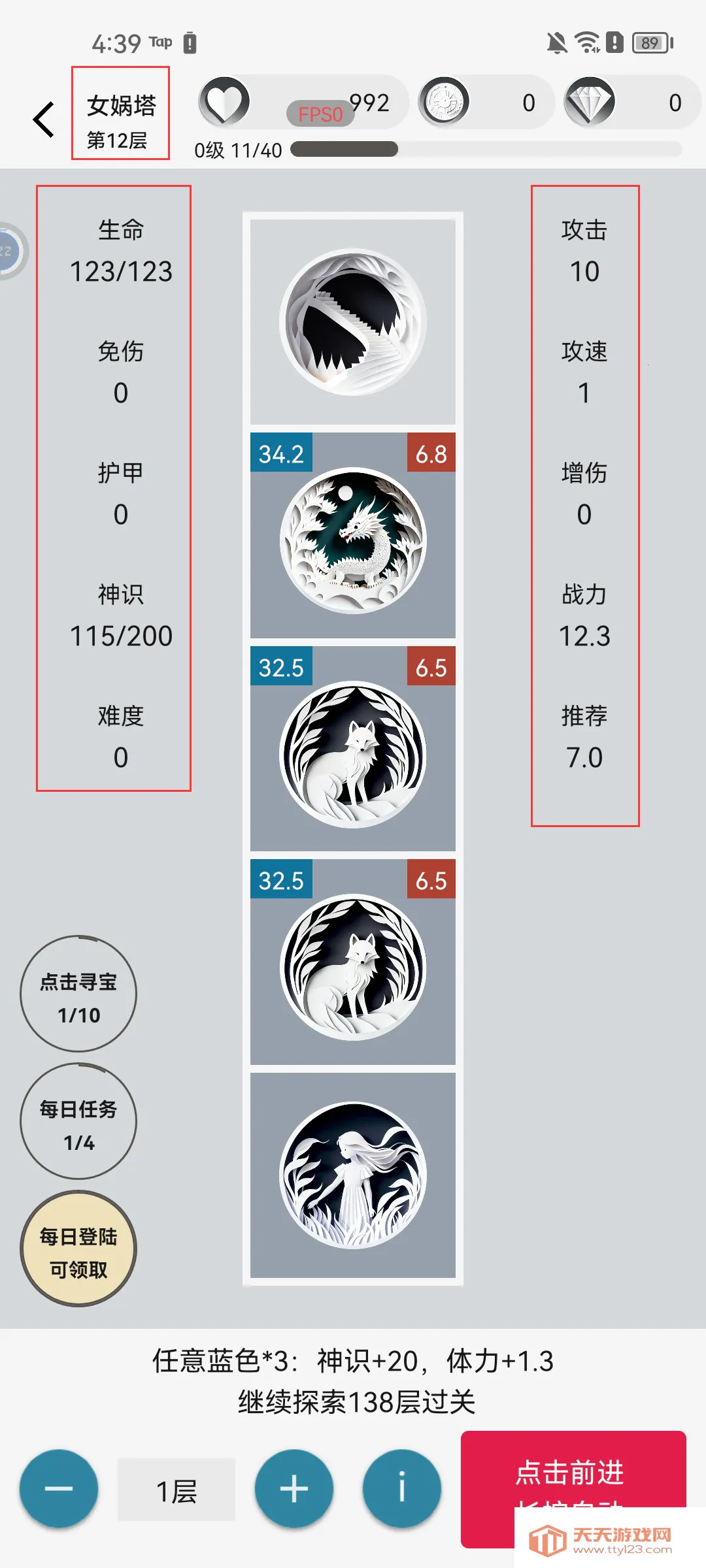1. 挂机玩法:架构偏向挂机,设定体力条,爬塔消耗体力,还有挂机奖励,能让玩家轻松变强。