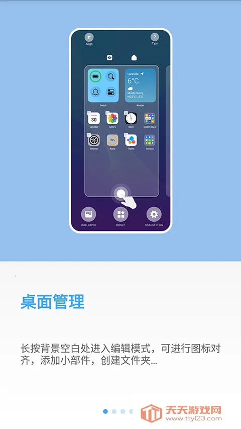 长按背景空白处进入编辑模拟,可进行图标对其,添加小部件,创建文件夹;