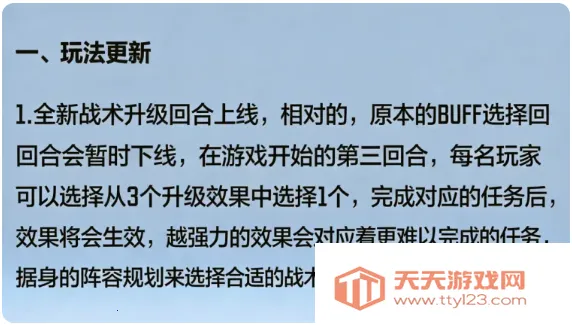 1、战术升级回合是本赛季替代了传统buff选择回合的全新机制,在游戏开局的第三回合,系统会为你提供三个不同的升级效果选项。
