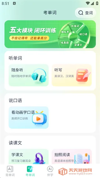 4、五大模块助提分:通过听、说、读、练、考五大模块闭环训练,巩固背单词成果,提升听力、语感、单词用法掌握及卷面分。