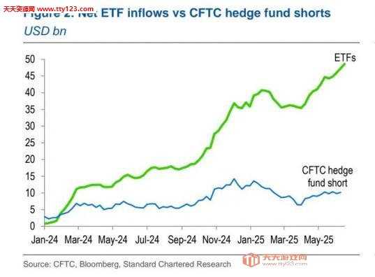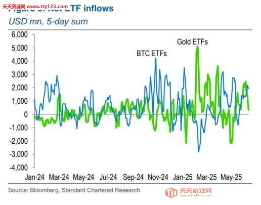 2025年第三季度,比特币公允价值突破795亿美元,机构持仓成本锁定在7.4万美元附近。渣打银行预测其价格将在季末触及13.5万美元,摩根大通则认为年底前有望达16.5万美元。支撑这一预期的,是美国现货比特币ETF持续强劲的资金流入。仅2025年第二季度,比特币ETF净流入达124亿美元,远超同期黄金ETF的69亿。到了第三季度,这一差距进一步扩大——渣打预测流入将超过前季,而黄金ETF却在5月出现28亿美元净流出。